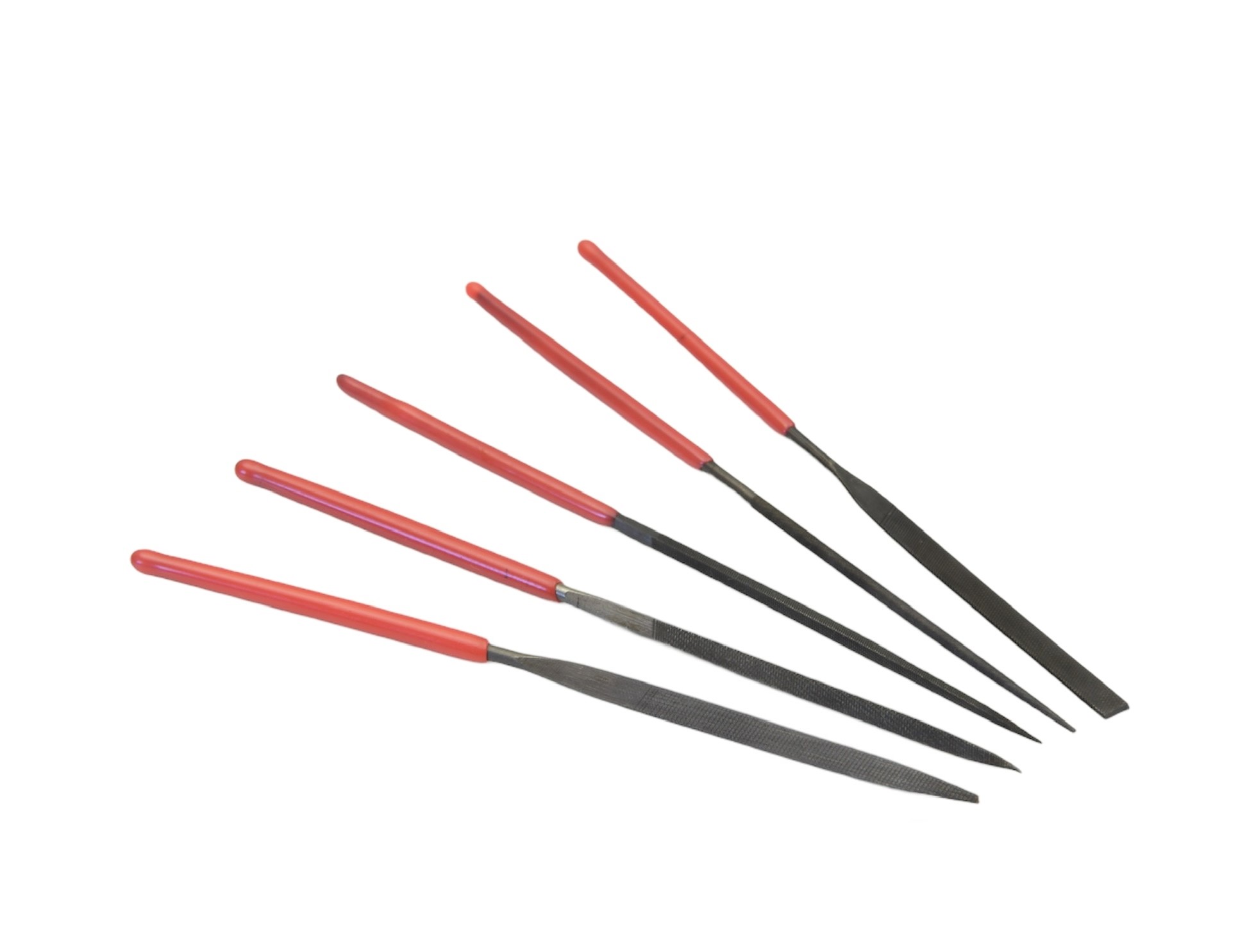 5pc Miniature Needle File set in wallet. Each file is only 100mm long x 2mm wide. Set comprises of the following shapes: Hand, 3 square, Half round, Round & Square.