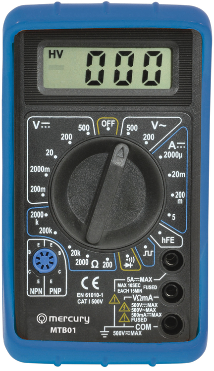 DIGITAL MULTIMETER 19 RANGE D03047 This handy digital multimeter offers 19 testing ranges and 7 functions and comes supplied ready to use with shrouded testing probes, PVC shockproof jacket and battery. Featuring a continuity test function, transistor test function and a square wave testing signal output. It is supplied with shrouded testing probes, PVC shockproof jacket and PP3 battery. Complies with EN61010 – 1:2010.