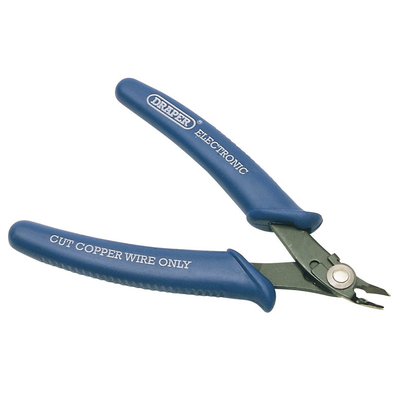 130MM ELECTRONIC THIN JAW NIPPER WITH CLIP CUTTERS pressed carbon steel, hardened and tempered for cutting copper wire up to 1.2mm diameter. Chemically blacked finish with soft grips and limiter feature. Cutting capacity 0.2-1.2mm copper wire. Flush cutting edges, ideal for cutting sprues.