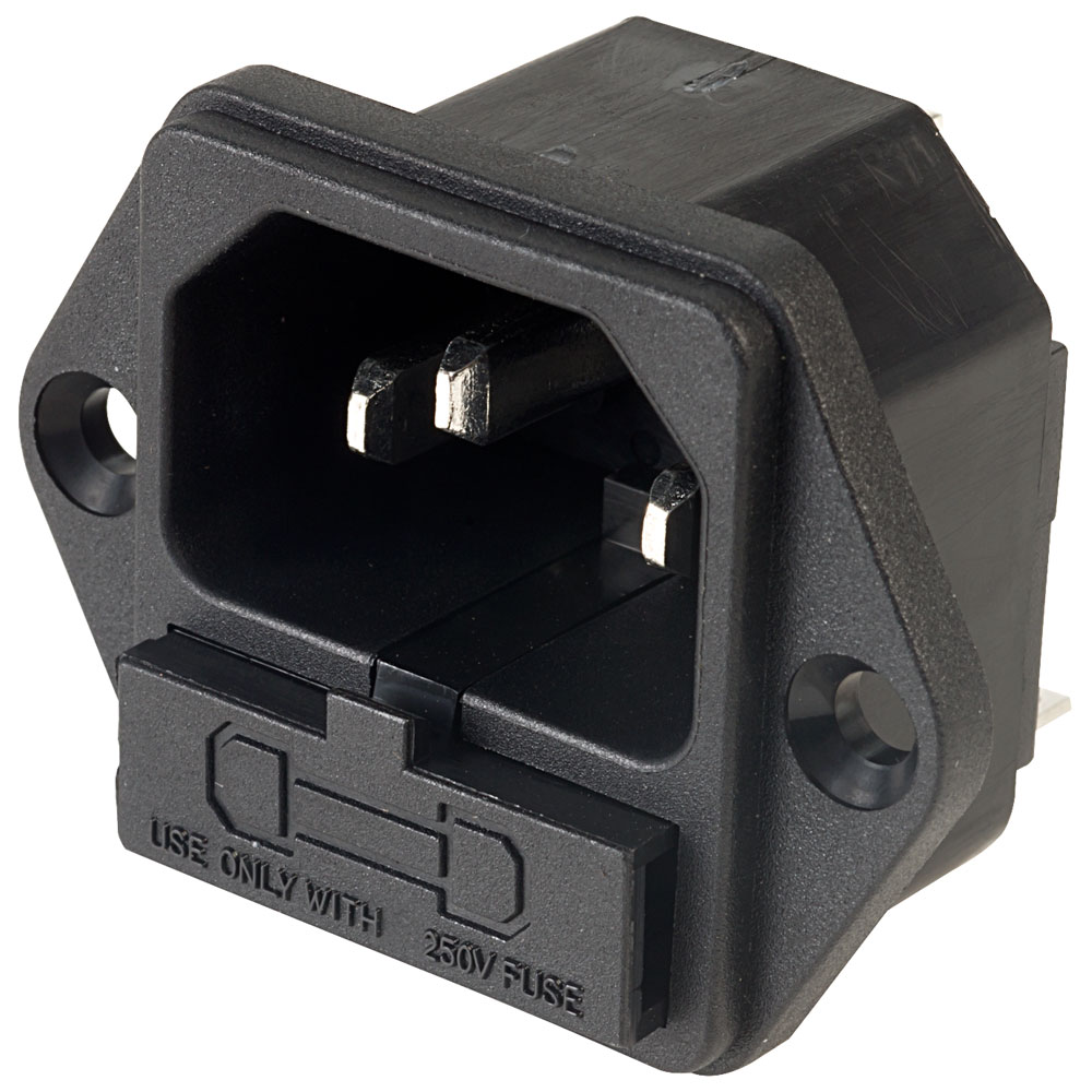 IEC FUSED CHASSIS MAINS INLET PLUG Panel mounting IEC fused mains inlet connectors manufactured to BS 4491, available with either 3.8mm or 6.3mm fast-on connections. The 5 x 20mm fuse is contained in a draw and has space for storing a spare. Used for connecting mains power to equipment. A rear insulating boot is available Code 560-525