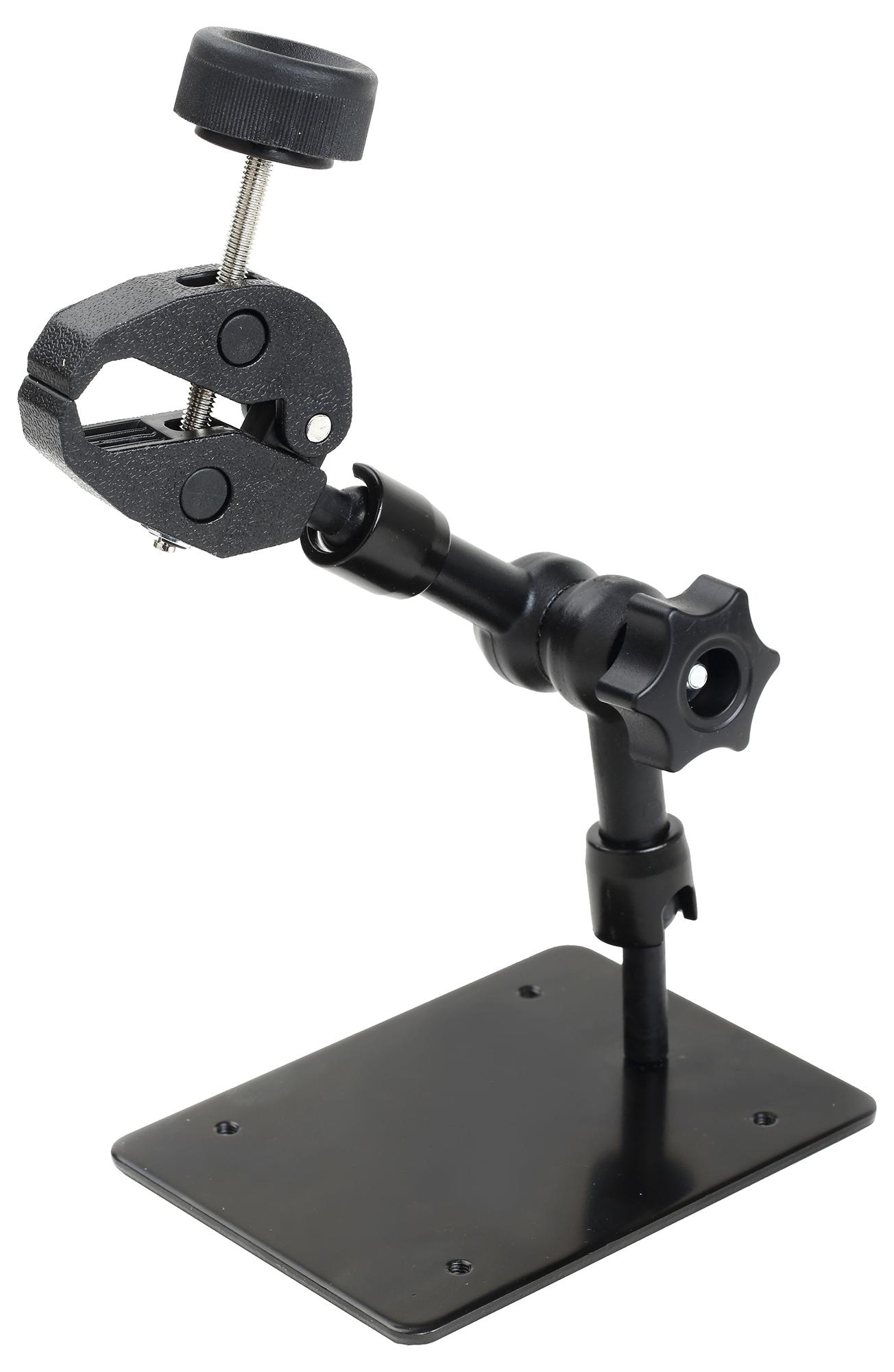 MULTI-ANGLE SOLDERING IRON HOLDER an invaluable addition to many soldering applications. The multi-angle arm will hold small to medium soldering irons and other small tools, the wrist and shoulder are ball joints, the elbow joint rotates through an arc and secured with a thumb screw. The jaws are adjusted/tightened also with a thumb screw. Manufactured from metal and heat resistant plastic.